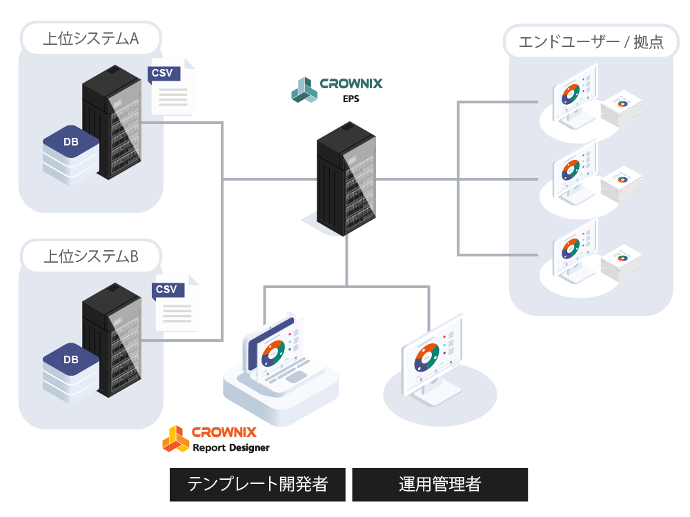 - エンドユーザー環境:CROWNIX Report Viewer / CROWNIX Report Launcher / データソース